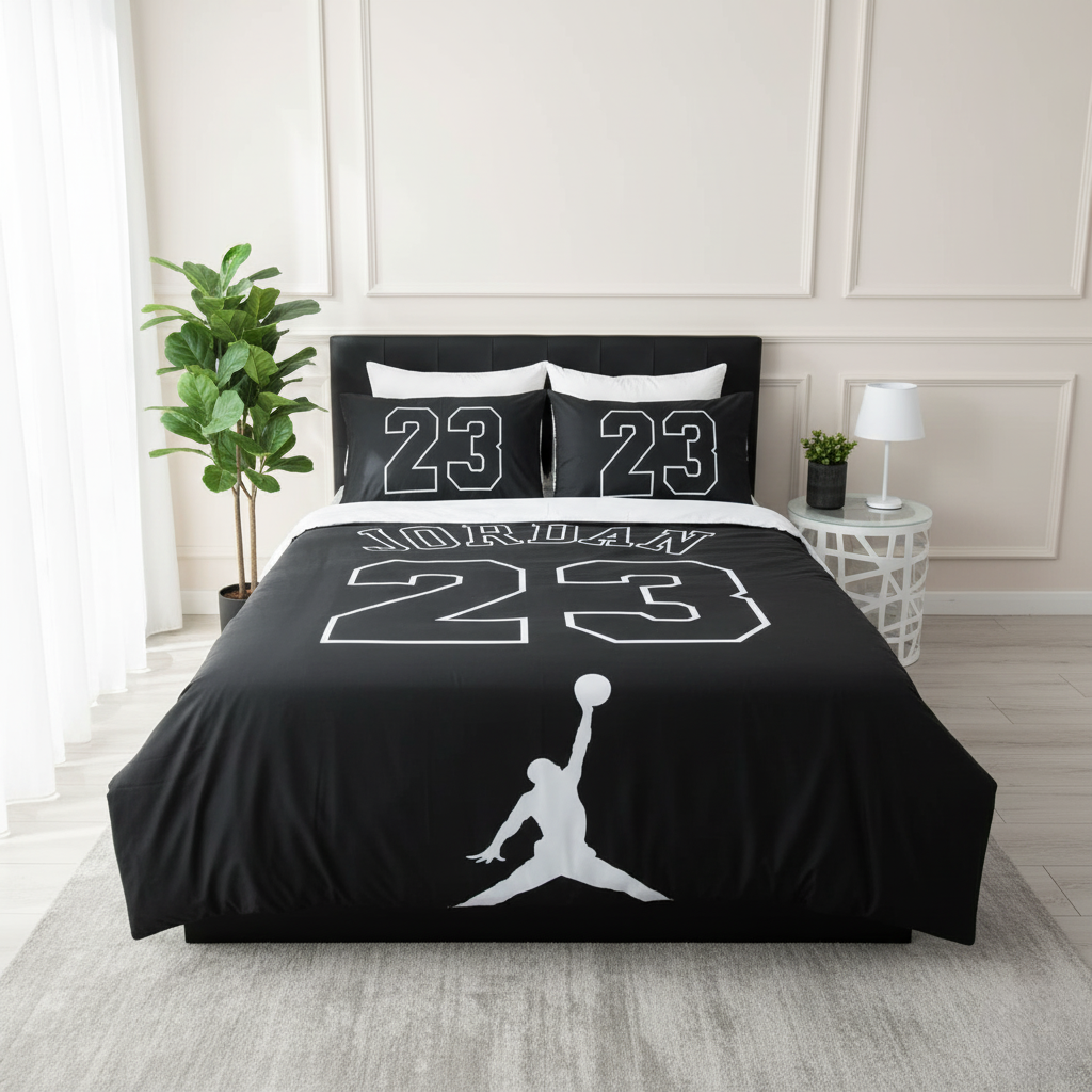 "Elevate your bedroom style with this sleek Jordan quilt cover, perfect for teens who love a sporty, modern vibe! Inspired by the iconic Jordan brand, this quilt cover features bold graphics and a contemporary design with cool tones.
